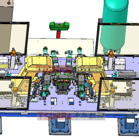 機(jī)器人或者人工上料,放置于定位夾具定位銷內(nèi);得到啟動(dòng)信號(hào)之后,氣缸夾緊工件;